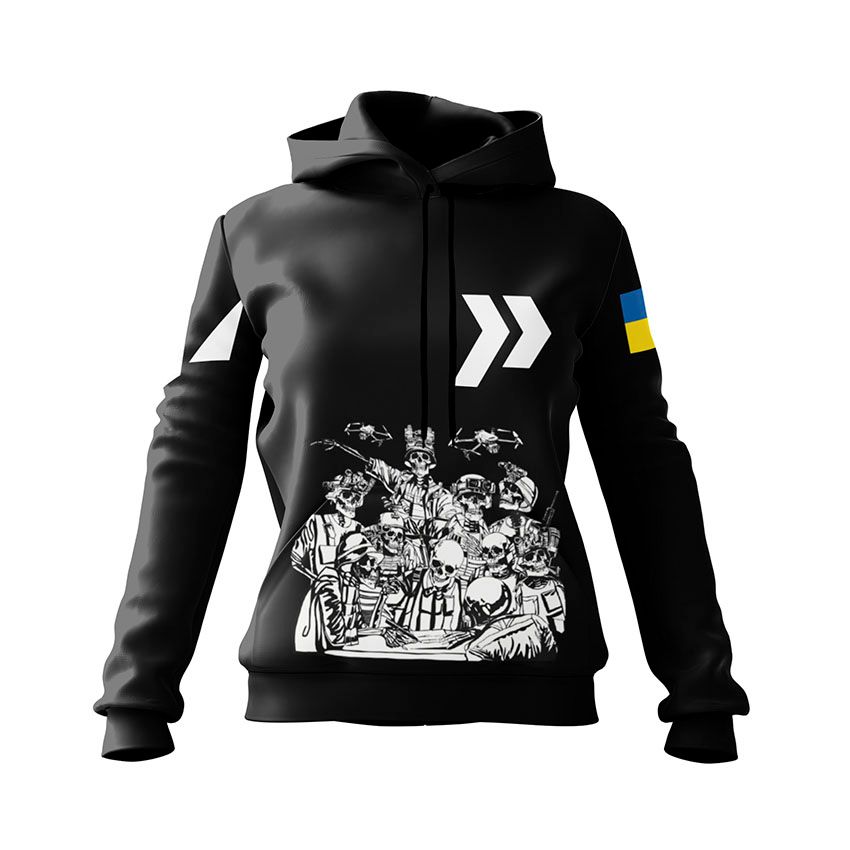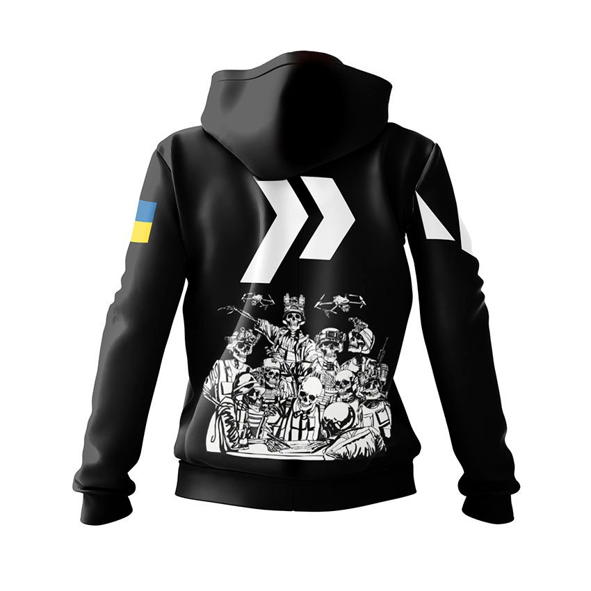 Принт символізує незламний дух українських воїнів, що залишаються на варті навіть після смерті. Скелети-дронарі уособлюють сучасну війну та технології. Худі з таким принтом підійде тим, хто пов’язаний із Силами безпілотних систем Збройних сил України, військовими технологіями або просто шанує дух спротиву і свободу України.