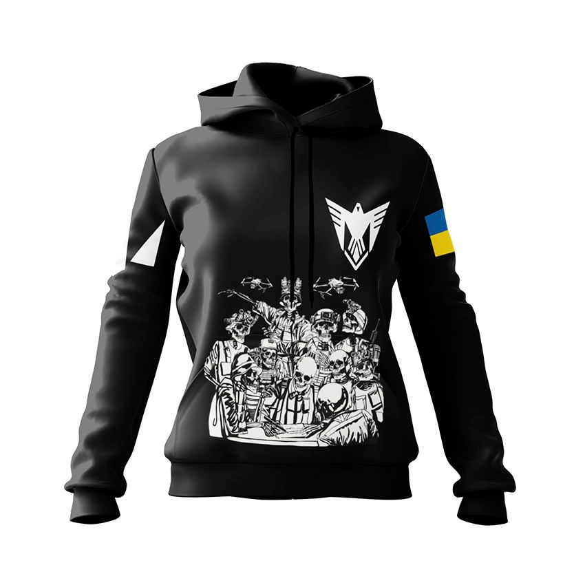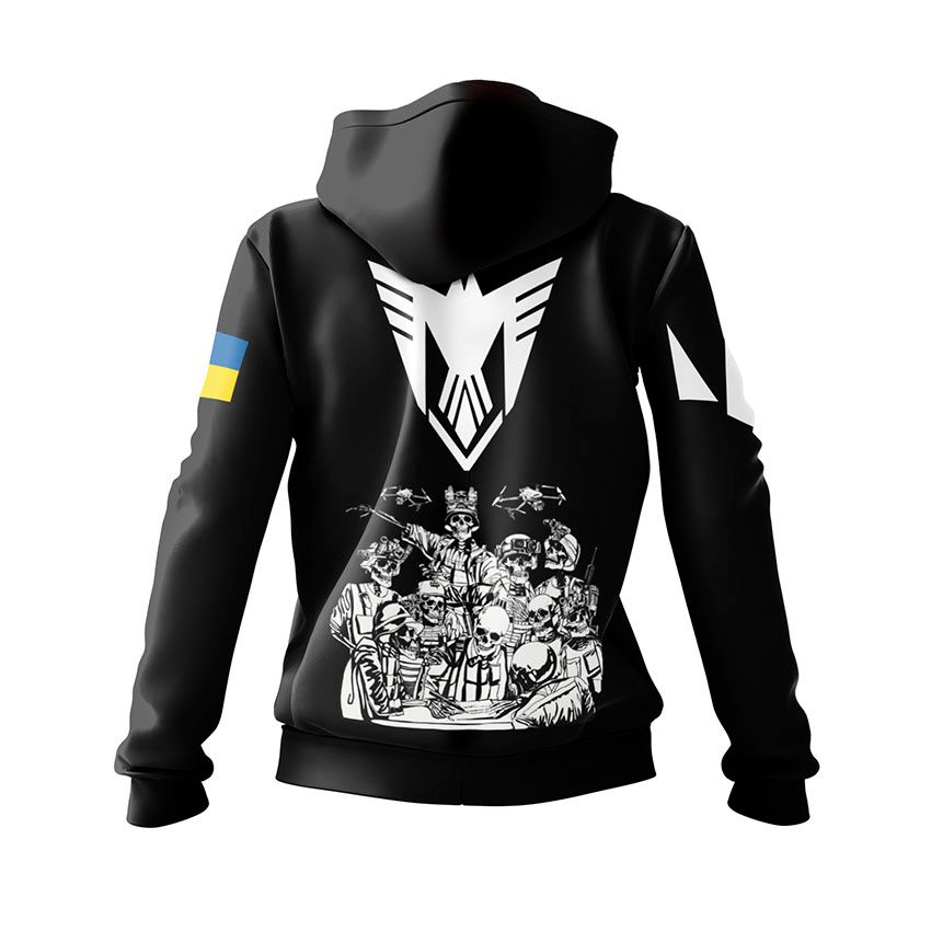 Принт символізує незламний дух українських воїнів, що залишаються на варті навіть після смерті. Скелети-дронарі уособлюють сучасну війну та технології. Худі з таким принтом підійде тим, хто пов’язаний із Силами безпілотних систем Збройних сил України, військовими технологіями або просто шанує дух спротиву і свободу України.
