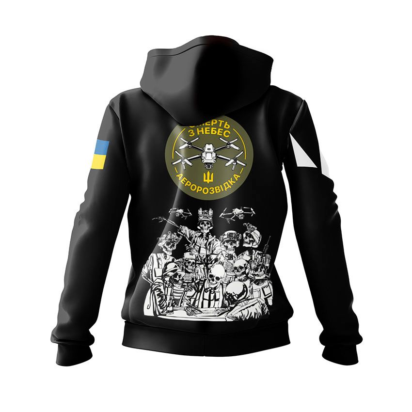 Принт символізує незламний дух українських воїнів, що залишаються на варті навіть після смерті. Скелети-дронарі уособлюють сучасну війну та технології. Худі з таким принтом підійде тим, хто пов’язаний із Силами безпілотних систем Збройних сил України, військовими технологіями або просто шанує дух спротиву і свободу України.
