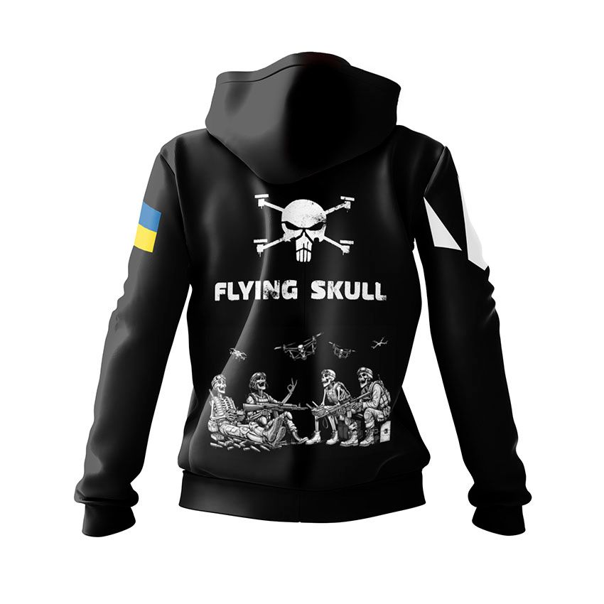 Принт зображує скелетів-операторів дронів, які продовжують боротися навіть після смерті. Це символ незламності, технічної майстерності та самопожертви воїнів ЗСУ. Худі з таким принтом підійде тим, хто пов’язаний із Силами безпілотних систем Збройних сил України, військовими технологіями або просто шанує дух спротиву і свободу України.
