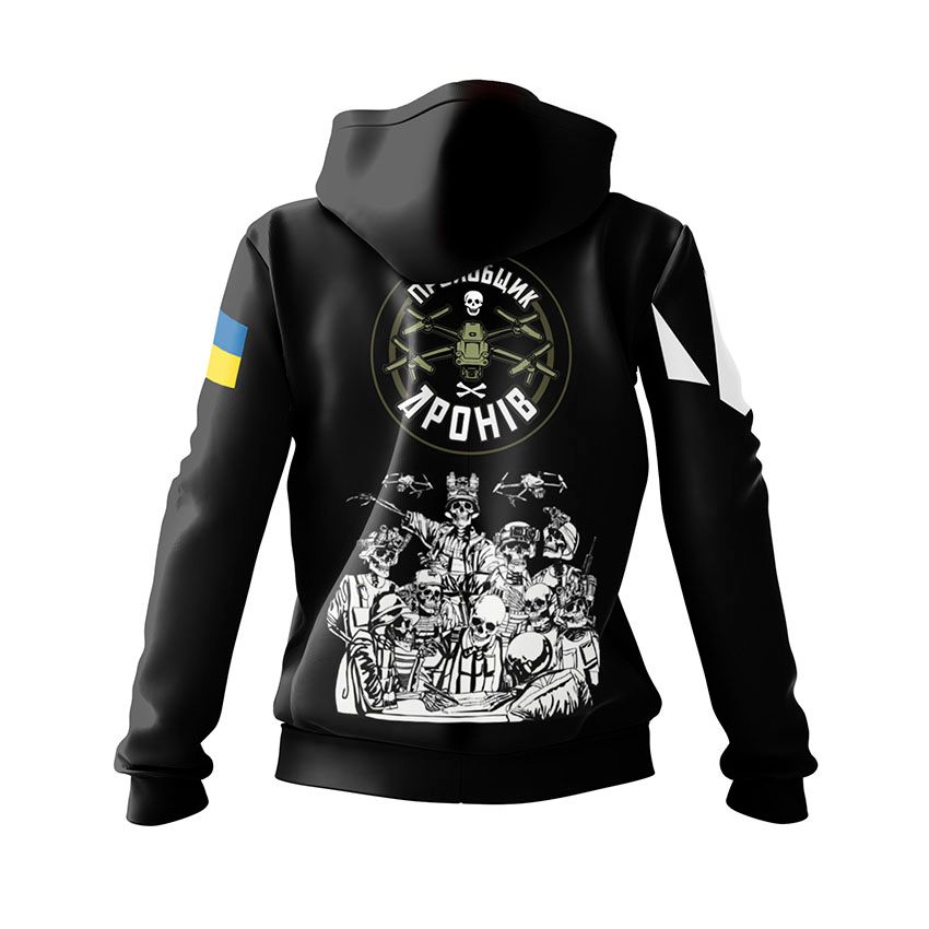 Принт символізує незламний дух українських воїнів, що залишаються на варті навіть після смерті. Скелети-дронарі уособлюють сучасну війну та технології. Худі з таким принтом підійде тим, хто пов’язаний із Силами безпілотних систем Збройних сил України, військовими технологіями або просто шанує дух спротиву і свободу України.