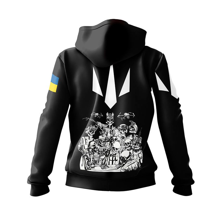 Принт символізує незламний дух українських воїнів, що залишаються на варті навіть після смерті. Скелети-дронарі уособлюють сучасну війну та технології. Худі з таким принтом підійде тим, хто пов’язаний із Силами безпілотних систем, військовими технологіями або просто шанує дух спротиву і свободу України.