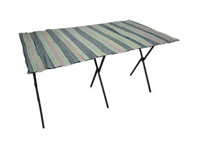Розкладний стіл (прилавок) складається із поліпропіленової стільниці, з вшитими рейками, та каркасу з металу, покритого порошковим фарбуванням. Габарити столу-прилавку дозволяють легко перевозити його у авто.