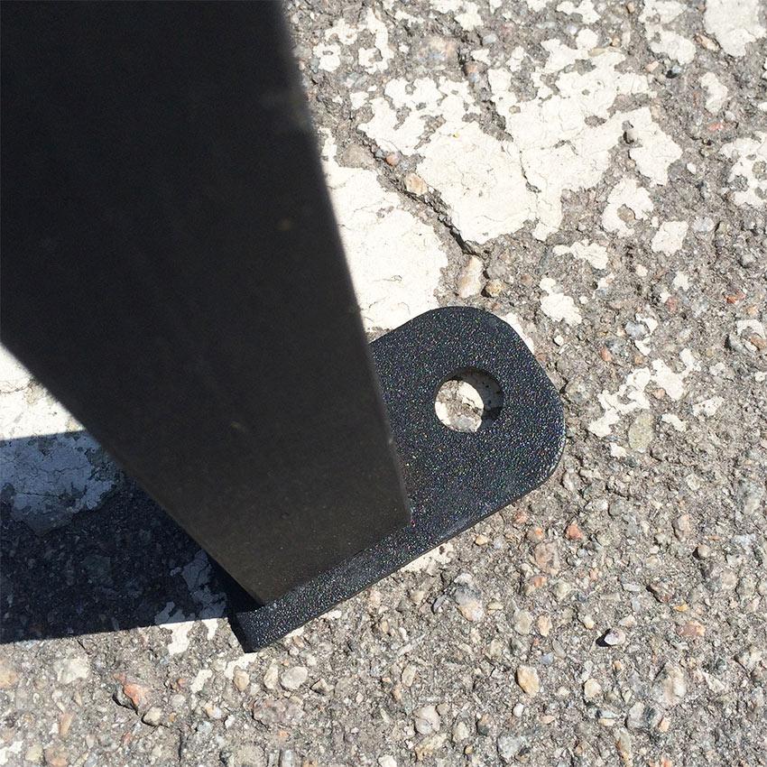 - Кожна стійка має пʼяту з отвором для анкера, через цей отвір ви можете закріпити стійки до поверхні анкерами, кілками або зафіксувати до додаткових обтяжувачів. Це необхідно для стабільності розсувного намету через його велику парусність.