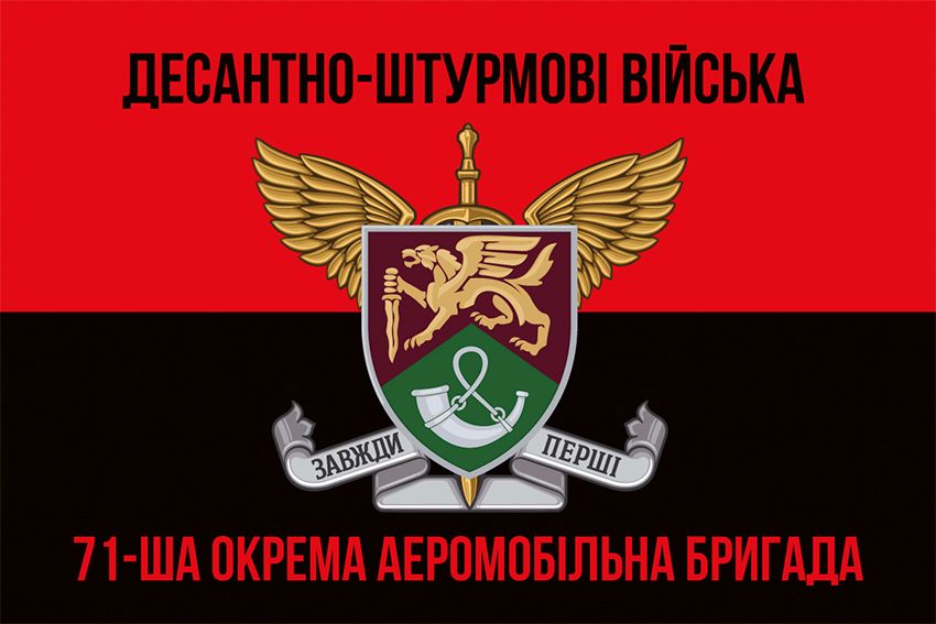 Флаг 71-я отдельная аэромобильная бригада (71 ОАэМБр) ДШВ ВСУ New красно-черный 1 с печатью изготавливаем из трех видов ткани: флажной сетки, атласа и габардина.