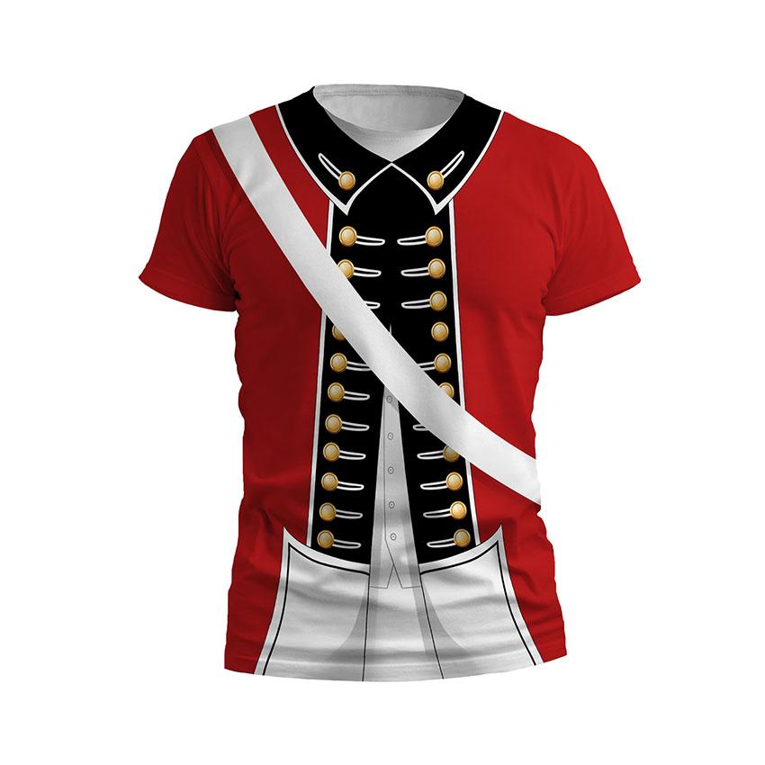 Принт воспроизводит классический образ британского солдата XVIII века. Красный мундир с золотыми пуговицами и белым поясом создает эффект формы, полной силы и дисциплины. Футболка с таким принтом подойдет для ценителей истории, реконструкторов или тех, кто ценит стиль с характером и атмосферой старины.