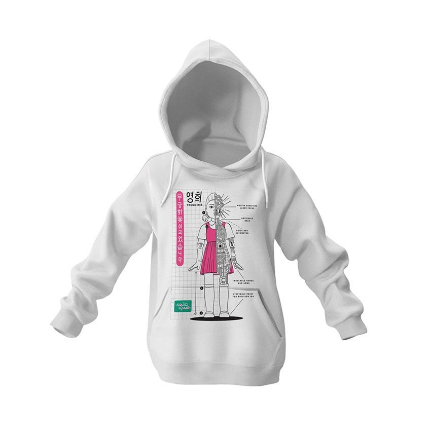 Принт с изображением легендарной куклы-робота из сериала «Игра в кальмара» в разрезе показывает ее механизм и детали. Худи с таким принтом станет отличным подарком для фанатов шоу и ценителей оригинального дизайна. Подойдет для повседневной носки или тематических мероприятий.