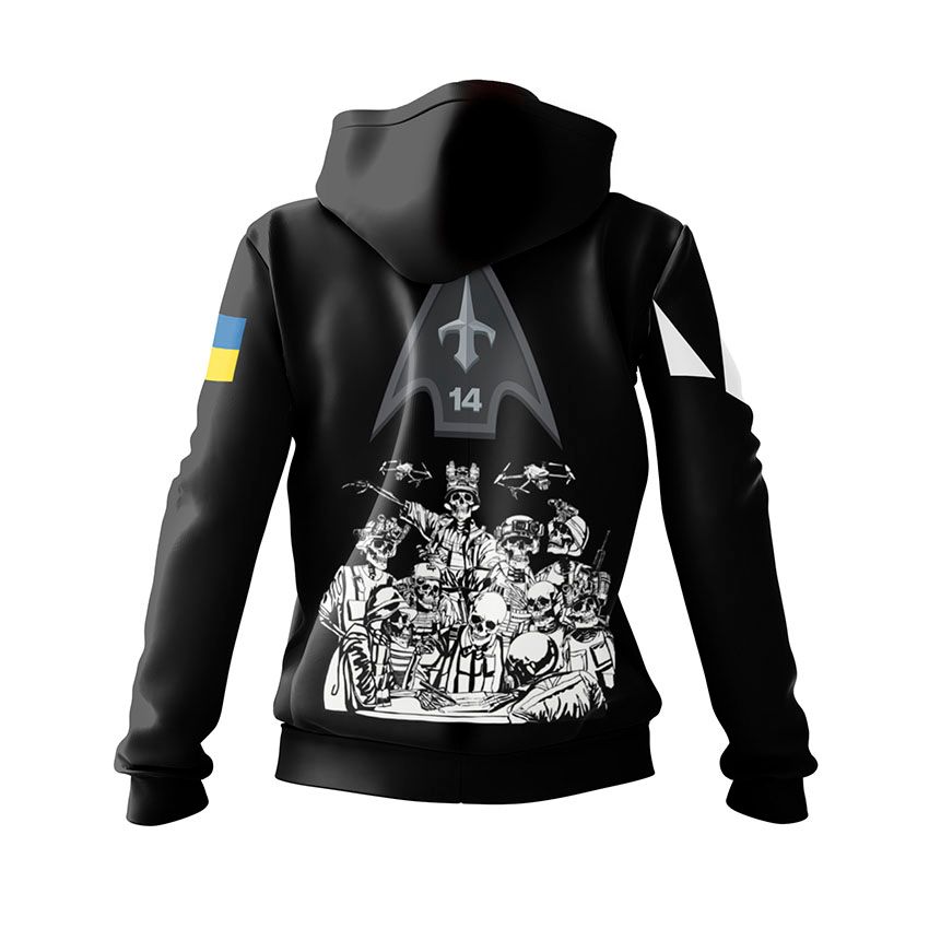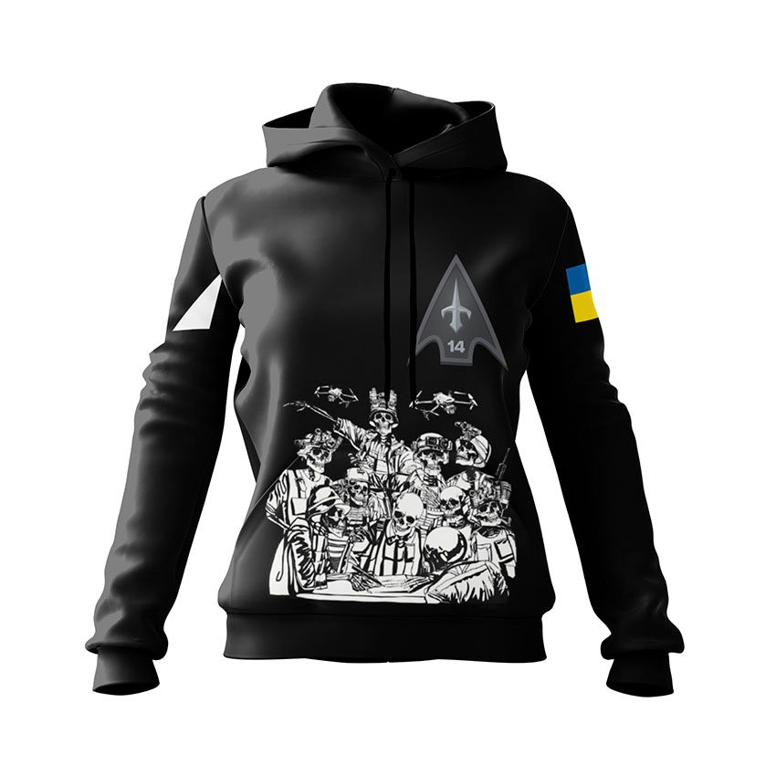 Принт символизирует несокрушимый дух украинских воинов, остающихся на страже даже после смерти. Скелеты-дроноводы олицетворяют современную войну и технологии. Худи с таким принтом подойдет тем, кто связан с Силами беспилотных систем Вооруженных сил Украины, военными технологиями или просто чтит дух сопротивления и свободу Украины.