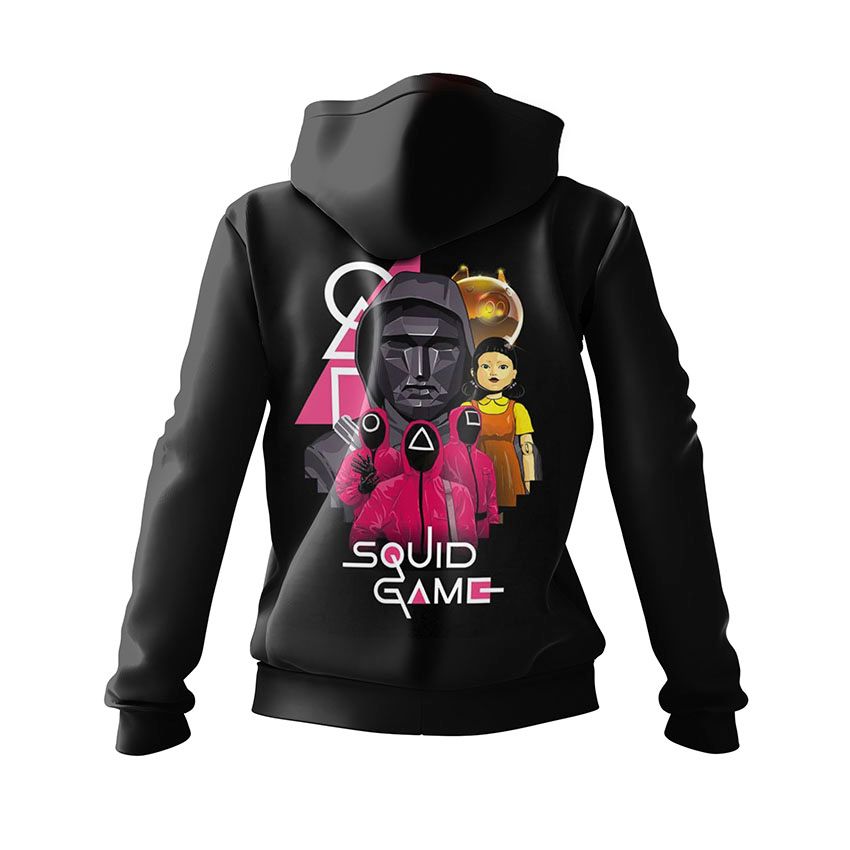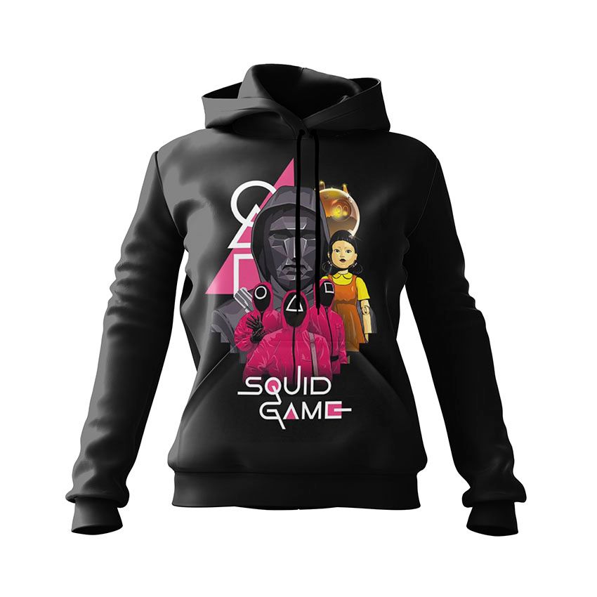 Худи с ярким графическим изображением ключевых символов сериала «Игра в кальмара»: кукла, маски с фигурами и лидер в капюшоне. Принт передает атмосферу напряжения и контроля. Худи с таким принтом подойдет фанатам сериала, поклонникам гик-культуры и ярких тематических вещей.