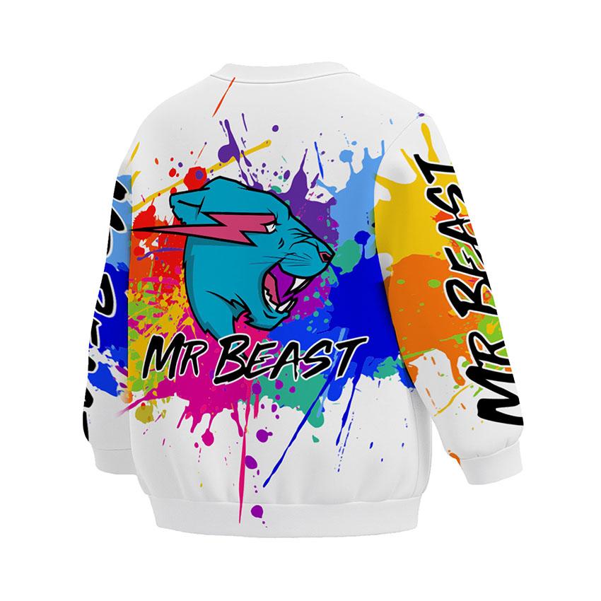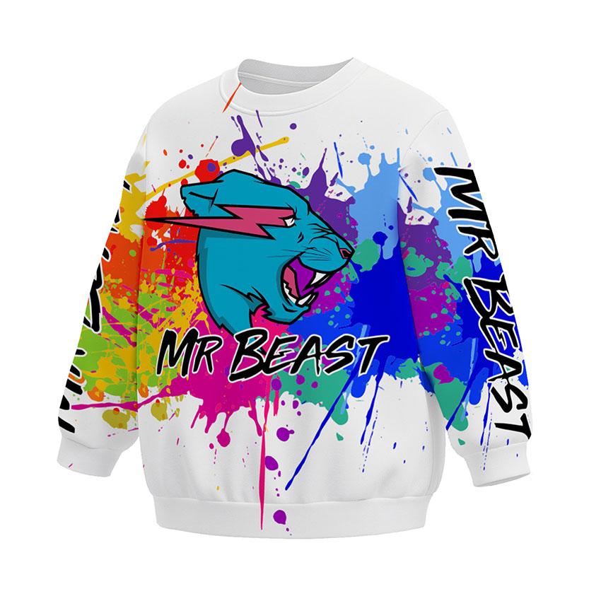 Свитшот детский с принтом «Мистер Бист. Взрыв красок. MrBeast. Color Explosion» — идеальный выбор для тех, кто ценит комфортную и функциональную одежду. Данная модель подходит как для активного дня в городе, так и для вечернего релакса дома. Данная модель подходит как для активных игр ребенка, так и для спокойных прогулок.